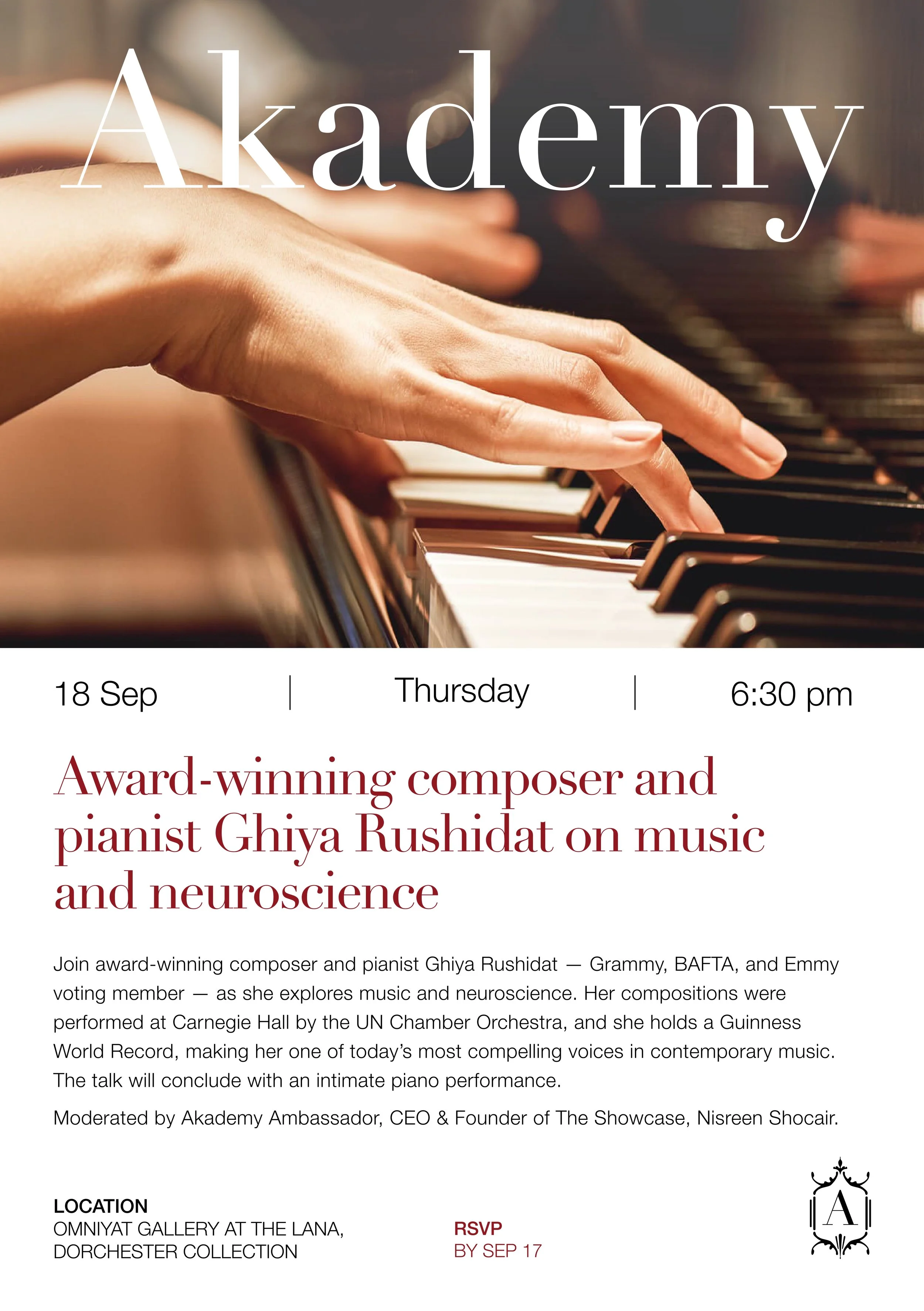 Ghiya Rushidat is an award-winning composer and pianist blending cinematic storytelling with neuroscience, with a western and ethnic identity. A Grammy, BAFTA, and Emmy voting member, she has scored films, games, and global events, performed at Carnegie Hall, and broken a Guinness World Record. She works between Los Angeles, Dubai, and Riyadh, and is a Sundance Lab Fellow mentored by Hollywood’s top composers.